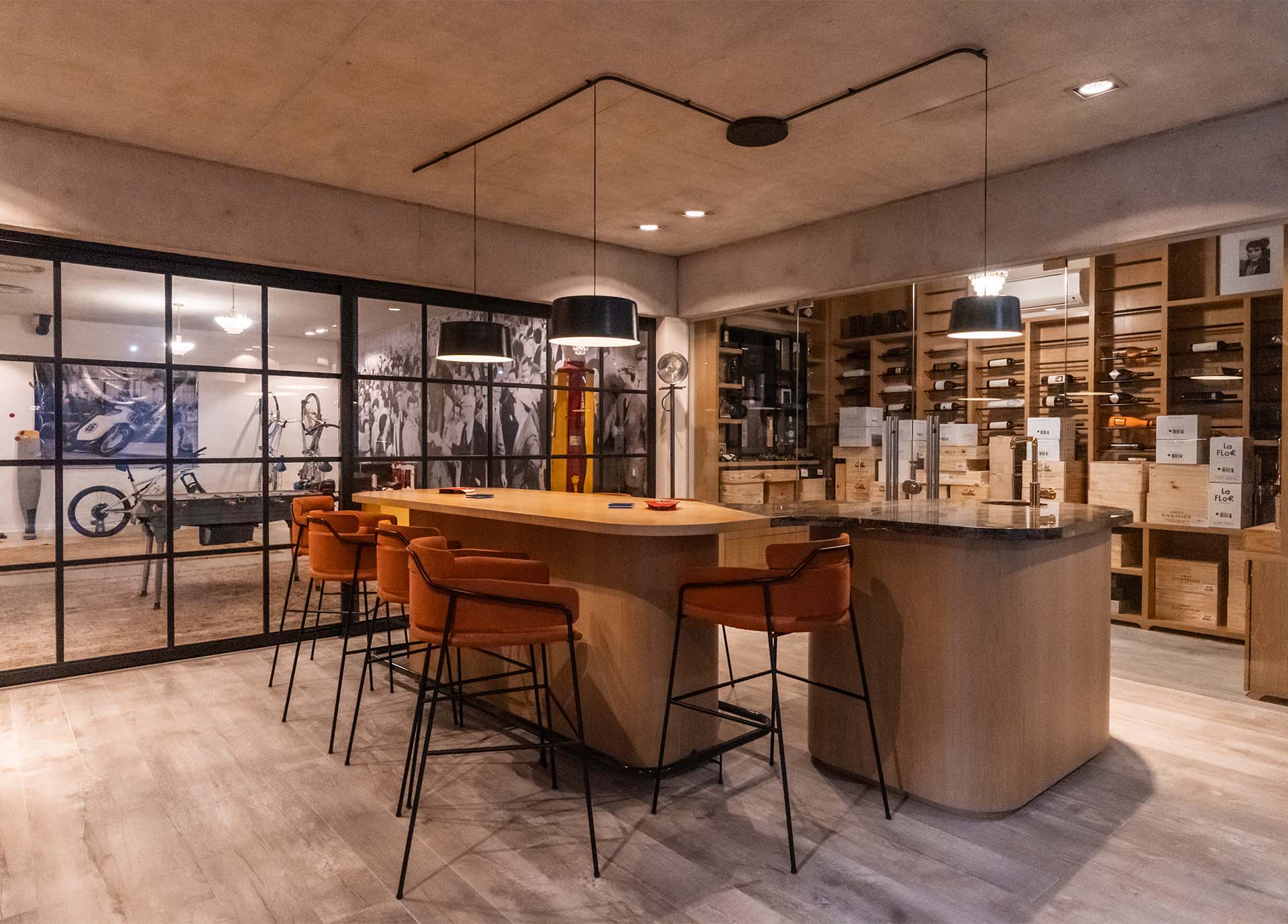 Las terminaciones exteriores son tabiques y vigas de hormigón visto, revestimientos en tablas de madera lapacho natural y piedra San Luis.